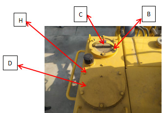 1、把推土鏟和松土器降到地面,使之停放牢靠,關(guān)閉發(fā)動機,并慢慢地轉(zhuǎn)動加油口(A)的蓋以釋放內(nèi)部壓力。然后把蓋拆下。